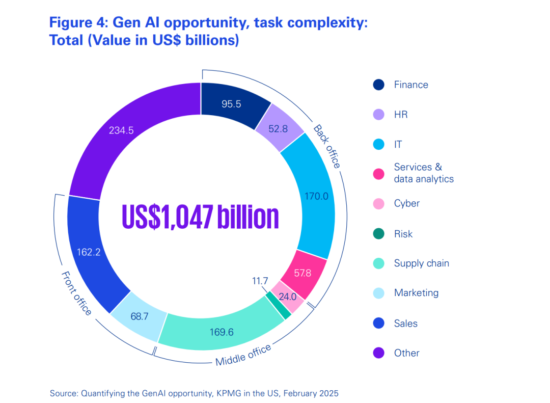 为指导客户的人工智能战略和投资,KPMG美国分析了大量数据以量化Gen AI的机遇。该分析计算了在企业所有潜在应用场景中全面部署和采用Gen AI的潜在价值。