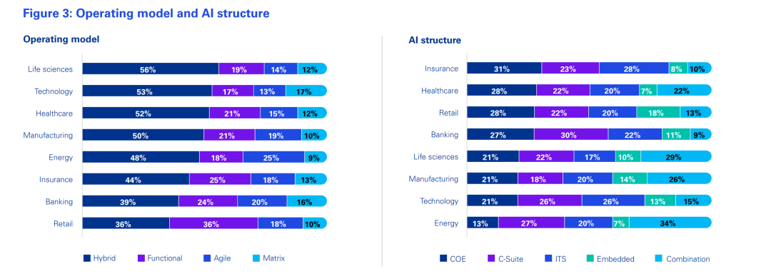 请描述贵公司当前管理及实施人工智能(AI)计划的结构?银行业(n=183)、保险业(n=183)、零售业(n=163)、科技行业(n=183)、医疗行业(n=183)、制造业(n=163)、能源行业(n=163)、生命科学行业(n=183)