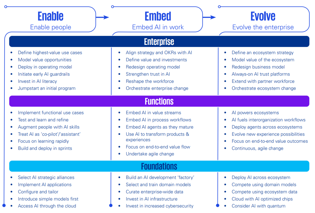 AI在企业中的价值实现路径存在差异,某些领域的创新更容易或更值得追求,而其他领域则不然。例如,同一企业的某些领域专注于基础效率(Enable),其他职能或价值流可能正在规模化应用AI以促进增长(Embed),而少数领域甚至正在探索生态系统内的变革性机会(Evolve)。
