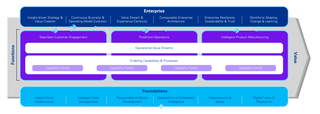 本蓝图概述了AI驱动、以客户为中心的组织的关键高级能力。智能企业通过运用先进技术、个性化体验、数据驱动的洞察和自动化运营,提升效率、创新能力和韧性。通过在价值流、能力中心和流程中嵌入智能,确保无缝的客户互动、稳健的风险管理、智能产品制造以及面向未来的适应性,从而在智能经济中蓬勃发展。
