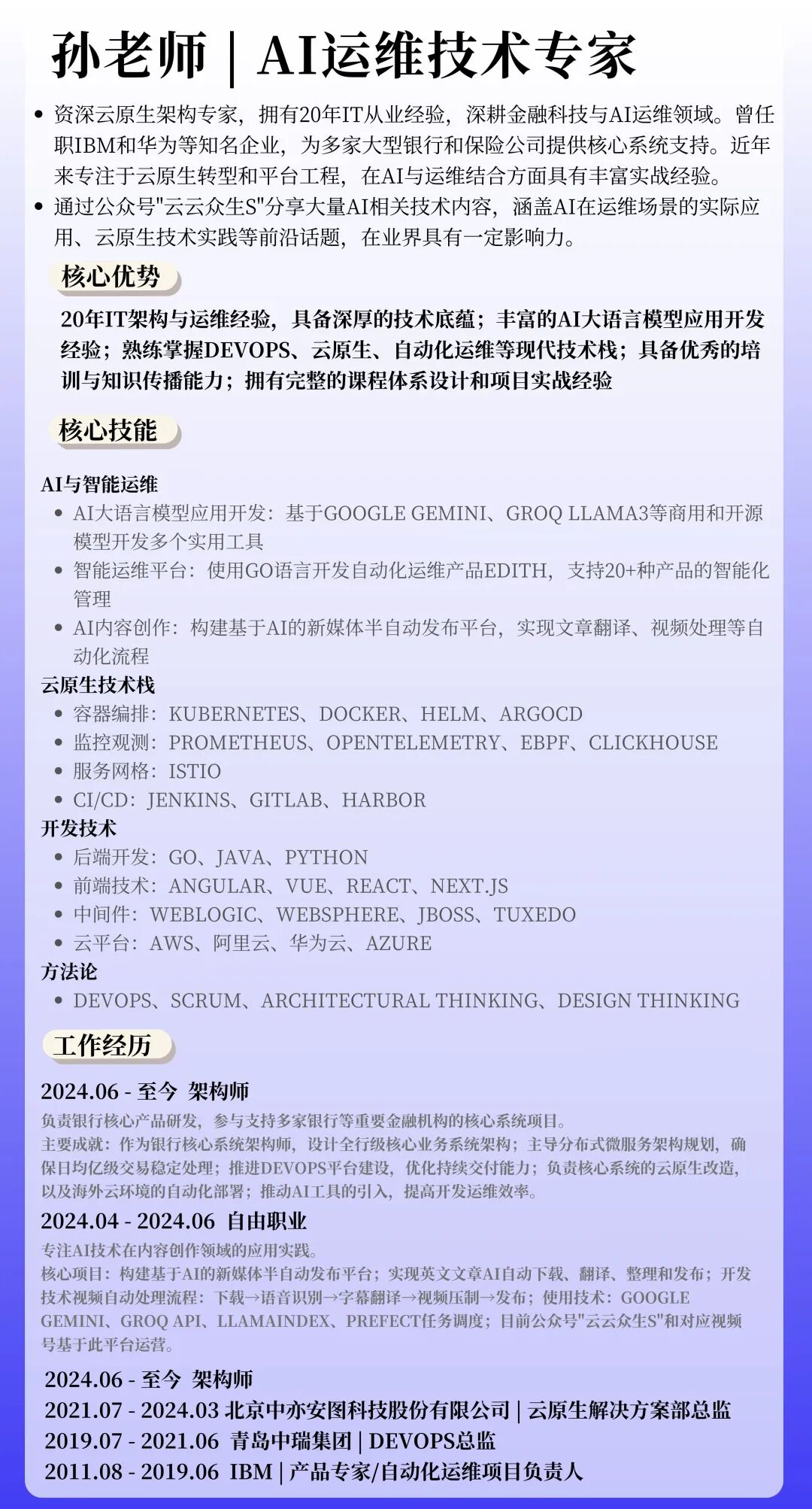 实训不仅涵盖了技术层面的深入讲解,还包括团队技能培养、项目管理策略和未来趋势的前瞻性讨论。通过互动环节,学员将有机会与同行交流心得,共同探讨大模型在各自领域的应用潜力。本课程适合希望在运维领域保持竞争力的资深工程师和团队领导者,帮助他们在大模型时代中把握先机,引领变革。