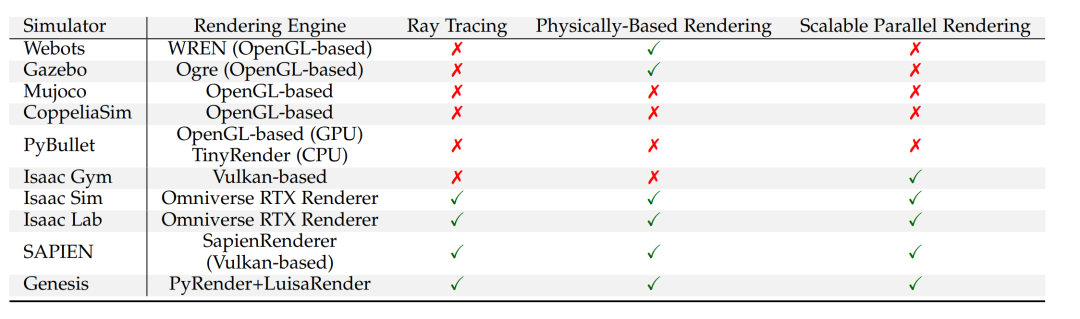 物理仿真器分析:对主流仿真器(Webots、Gazebo、MuJoCo、Isaac Gym/Sim/Lab等)进行综合对比分析,涵盖物理仿真能力、渲染质量及传感器支持。
