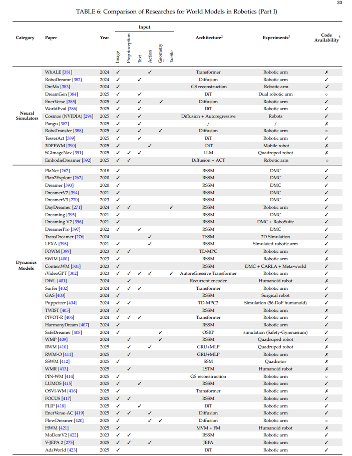 2 DiT = 扩散Transformer;RSSM = 循环状态空间模型;TSSM = Transformer状态空间模型;SSM = 状态空间模型;TD-MPC = 时序差分模型预测控制;OSRP = 在线安全奖励规划;GRU = 门控循环单元;MLP = 多层感知机;LSTM = 长短期记忆;GS = 高斯泼溅;MVM = 掩码视频建模;FM = 流匹配;JEPA = 联合嵌入预测架构。